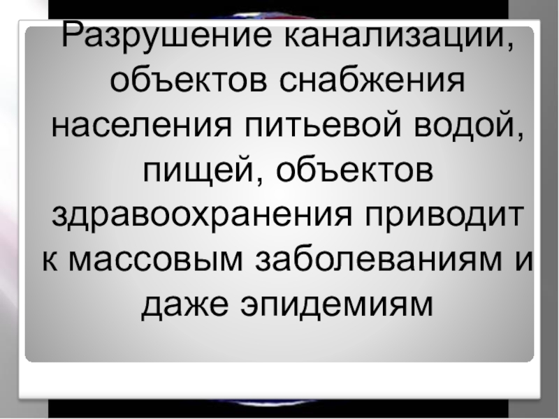 Слайд 33Разрушение канализации, объектов снабжения населения питьевой водой, пищей, объектов здравоохранения приводит