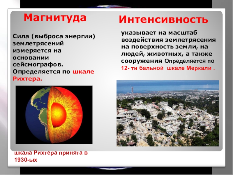 Слайд 43Интенсивность указывает на характер и масштаб воздействия землетрясений на поверхность земли,