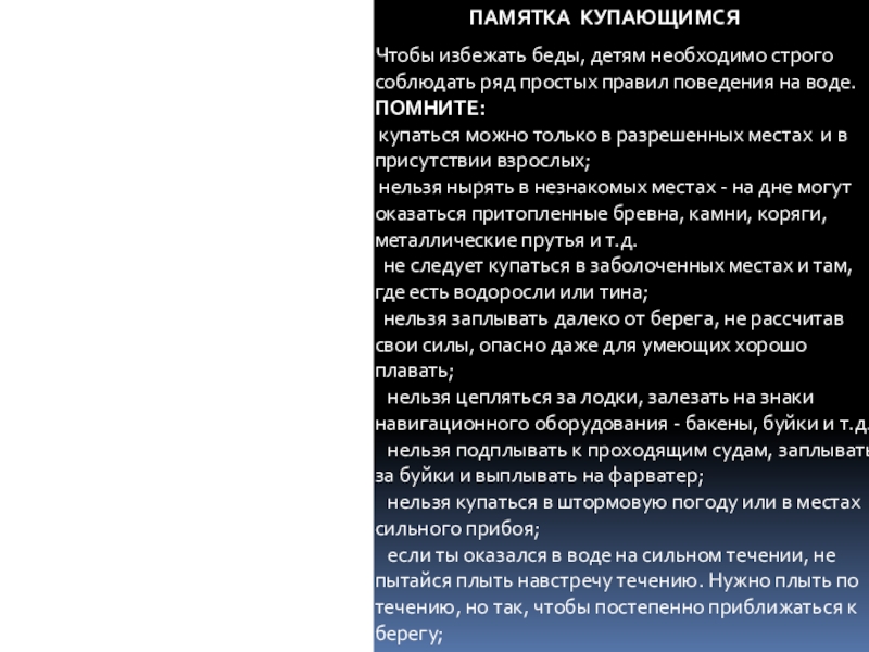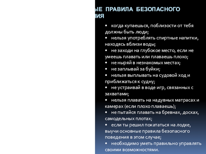 • не заходи на глубокое место, если не умеешь плавать или плаваешь плохо;