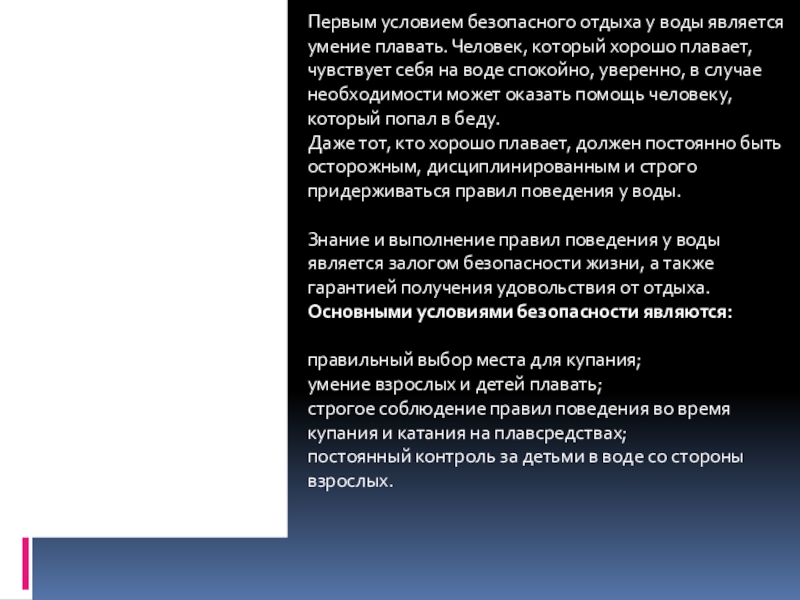 Слайд 6Первым условием безопасного отдыха у воды является умение плавать. Человек, который