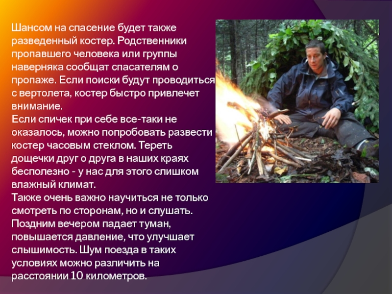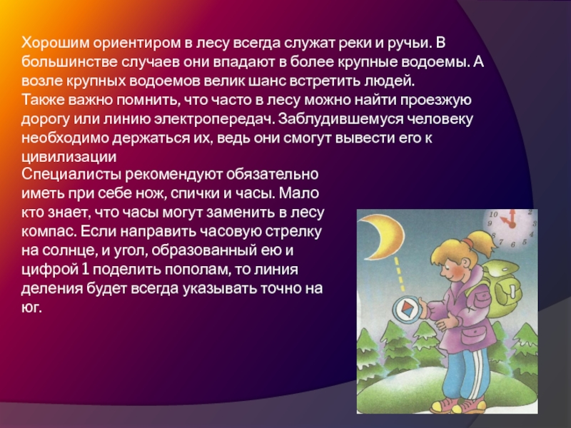 Специалисты рекомендуют обязательно иметь при себе нож, спички и часы. Мало кто знает, что часы могут заменить в лесу компас. Если направить часовую стрелку на солнце, и угол, образованный ею и цифрой 1 поделить пополам, то линия деления будет всегда указывать точно на юг.