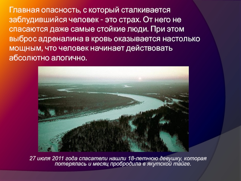 27 июля 2011 года спасатели нашли 18-летнюю девушку, которая потерялась и месяц пробродила в якутской тайге.