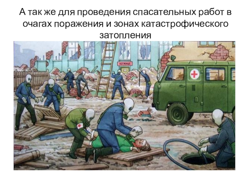 Слайд 15А так же для проведения спасательных работ в очагах поражения и