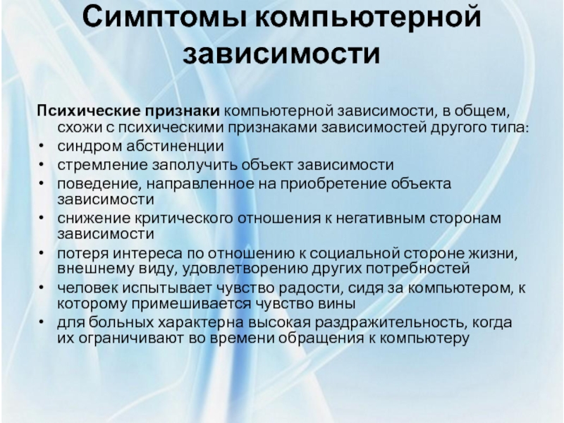 Симптомы компьютерной зависимости Психические признаки компьютерной зависимости, в общем, схожи с психическими признаками зависимостей другого типа: синдром