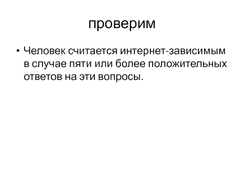 проверимЧеловек считается интернет-зависимым в случае пяти или более положительных ответов на эти вопросы.