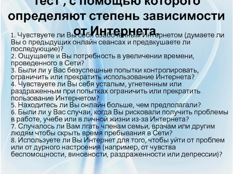 1. Чувствуете ли Вы себя озабоченным Интернетом (думаете ли Вы о предыдущих онлайн сеансах и предвкушаете ли последующие)? 2. Ощущаете и Вы потребность в увеличении времени, проведенного в Сети? 3. Были ли у Вас безуспешные попытки контролировать, ограничить или прекратить использование Интернета? 4. Чувствуете ли Вы себя усталым, угнетенным или раздраженным при попытках ограничить или прекратить пользование Интернетом? 5. Находитесь ли Вы онлайн больше, чем предполагали? 6. Были ли у Вас случаи, когда Вы рисковали получить проблемы в работе, учебе или в личной жизни из-за Интернета? 7. Случалось ли Вам лгать членам семьи, врачам или другим людям чтобы скрыть время пребывания в Сети? 8. Используете ли Вы Интернет для того, чтобы уйти от проблем или от дурного настроения (например, от чувства беспомощности, виновности, раздраженности или депрессии)?