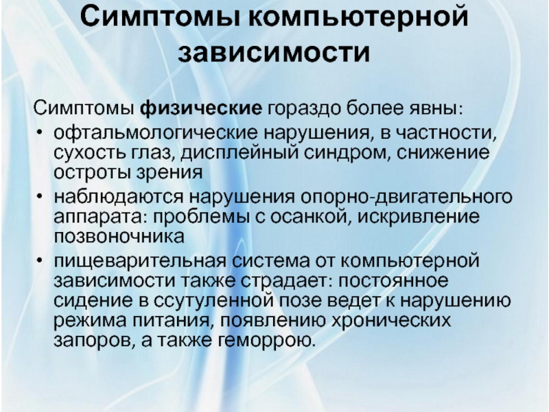 Симптомы компьютерной зависимости Симптомы физические гораздо более явны: офтальмологические нарушения, в частности, сухость глаз, дисплейный синдром, снижение