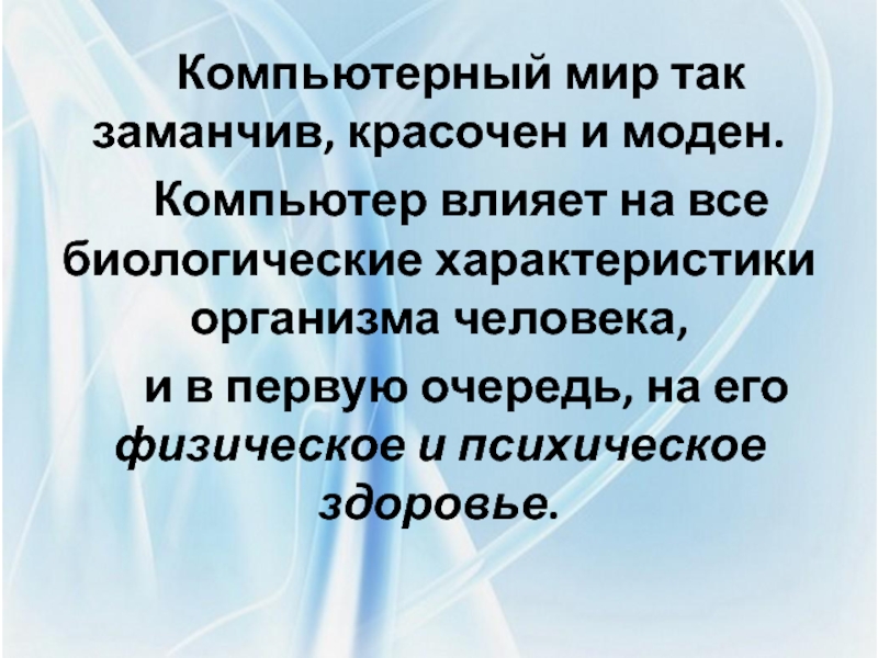 Компьютерный мир так заманчив, красочен и моден. Компьютер влияет на все биологические характеристики организма человека, и в