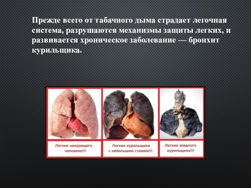 Слайд 4Прежде всего от табачного дыма страдает легочная система, разрушаются механизмы защиты