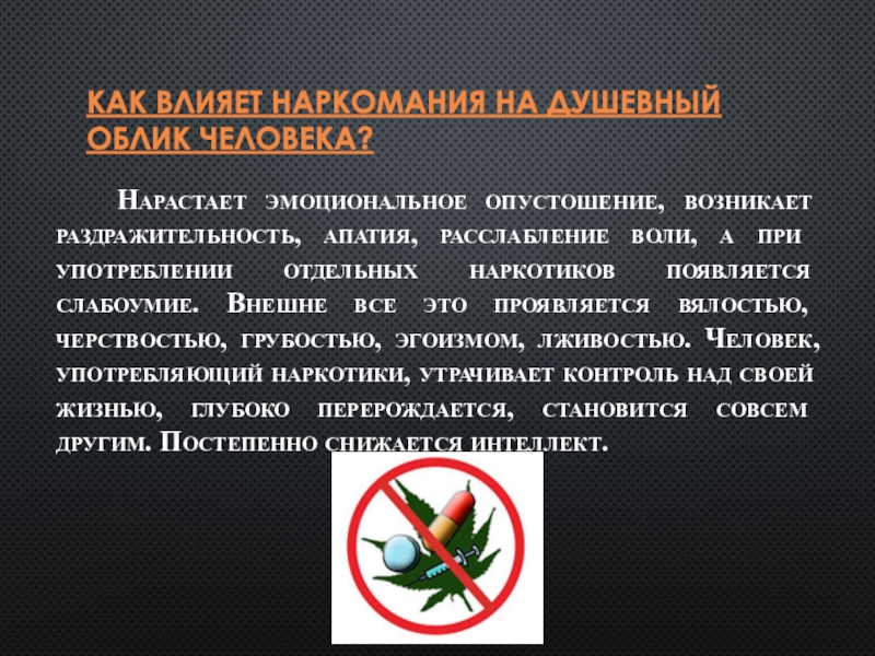 КАК ВЛИЯЕТ НАРКОМАНИЯ НА ДУШЕВНЫЙ ОБЛИК ЧЕЛОВЕКА?