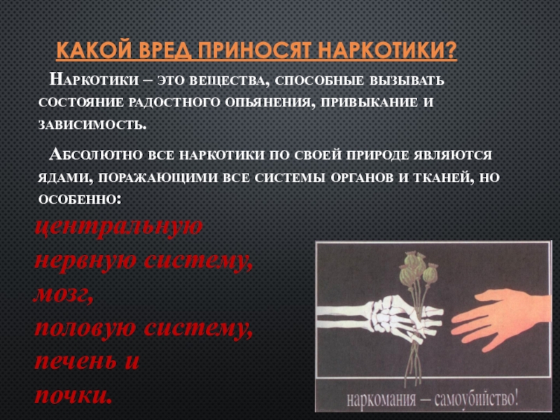 Слайд 14КАКОЙ ВРЕД ПРИНОСЯТ НАРКОТИКИ?