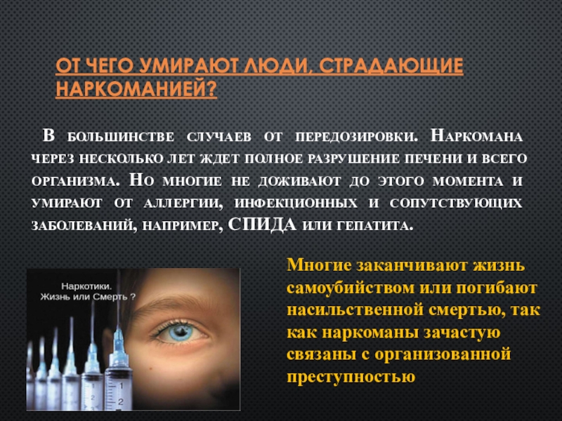 Многие заканчивают жизнь самоубийством или погибают насильственной смертью, так как наркоманы зачастую связаны с организованной преступностью