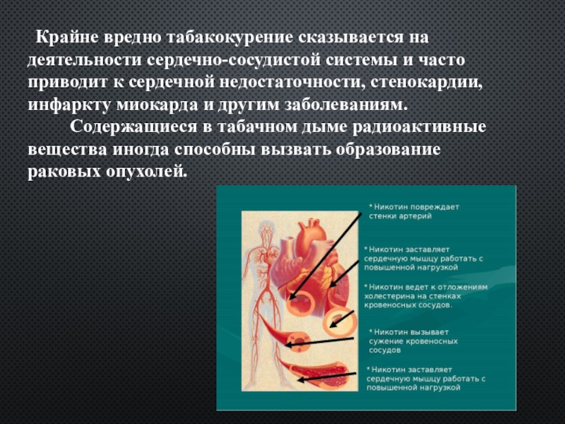 Слайд 6 Крайне вредно табакокурение сказывается на деятельности сердечно-сосудистой системы и часто