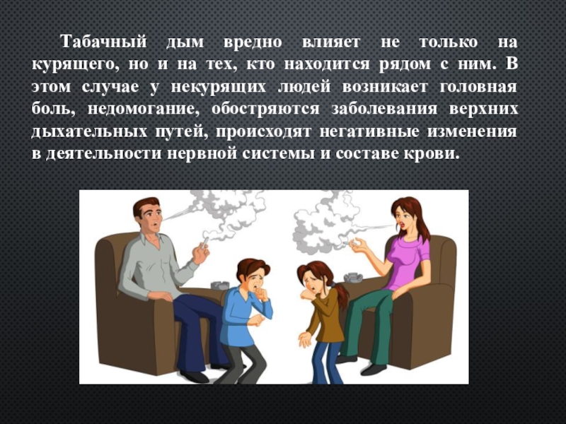 тех, кто находится рядом с ним. В этом случае у некурящих людей возникает головная боль, недомогание, обостряются заболевания верхних дыхательных путей, происходят негативные изменения в деятельности нервной системы и составе крови.