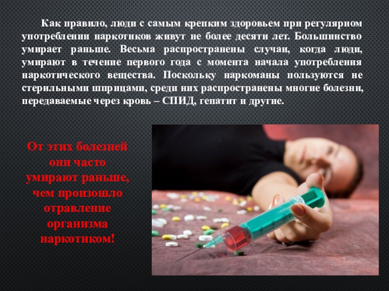 живут не более десяти лет. Большинство умирает раньше. Весьма распространены случаи, когда люди, умирают в течение первого года с момента начала употребления наркотического вещества. Поскольку наркоманы пользуются не стерильными шприцами, среди них распространены многие болезни, передаваемые через кровь – СПИД, гепатит и другие.