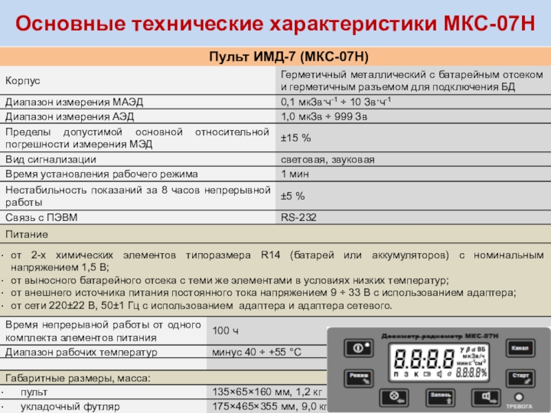 Масса прибора с элементами питания около 3,2 кг, а полного комплекта в укладочном ящике - 8,2 кг.