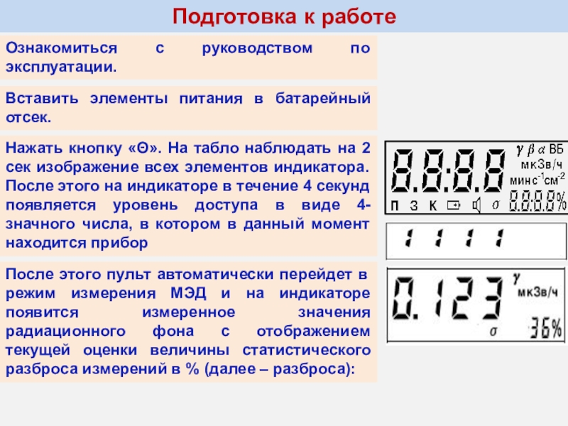 После этого пульт автоматически перейдет в режим измерения МЭД и на индикаторе появится измеренное значения радиационного фона с отображением текущей оценки величины статистического разброса измерений в % (далее – разброса):