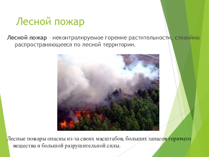 Лесные пожары опасны из-за своих масштабов, больших запасов горючего вещества и большой разрушительной силы.