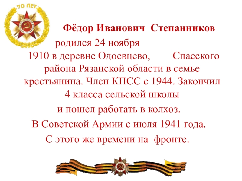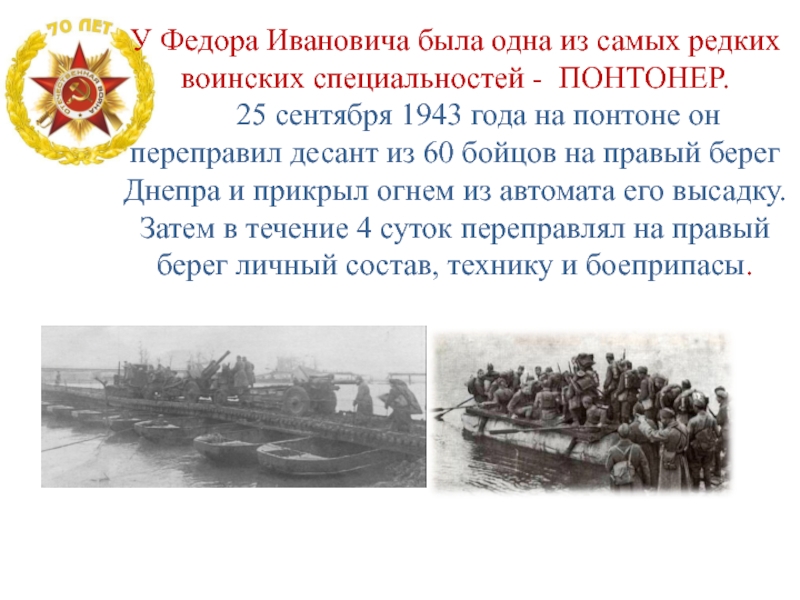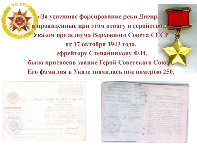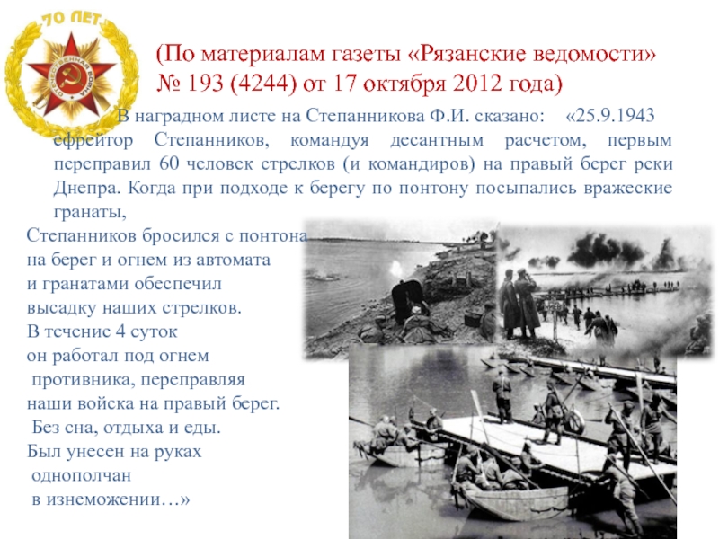 В наградном листе на Степанникова Ф.И. сказано: «25.9.1943 ефрейтор Степанников, командуя десантным расчетом, первым переправил 60 человек стрелков (и командиров) на правый берег реки Днепра. Когда при подходе к берегу по понтону посыпались вражеские гранаты,