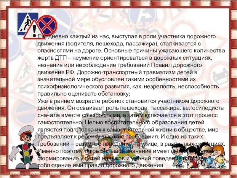 Детский дорожно-транспортный травматизм является одной из самых болезненных проблем современного общества. Ежегодно на дорогах России совершаются десятки тысяч дорожно-транспортных происшествий с участием детей и подростков. Именно поэтому профилактика дорожно-транспортного травматизма остаётся приоритетной проблемой общества, требующей решения, при всеобщем участии и самыми эффективными методами.