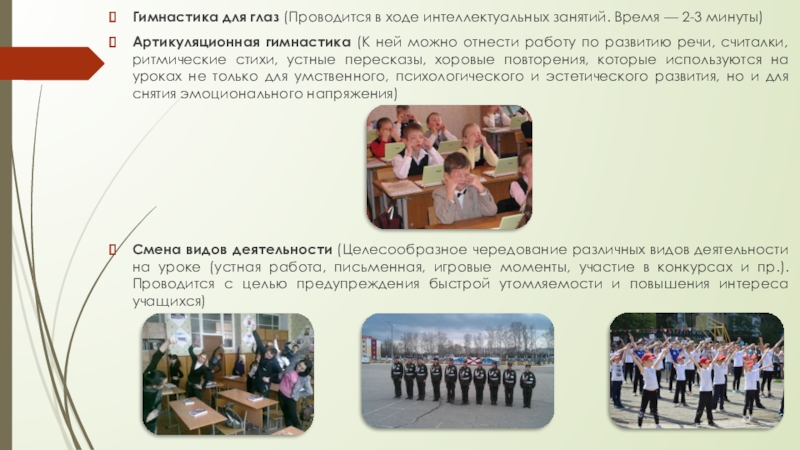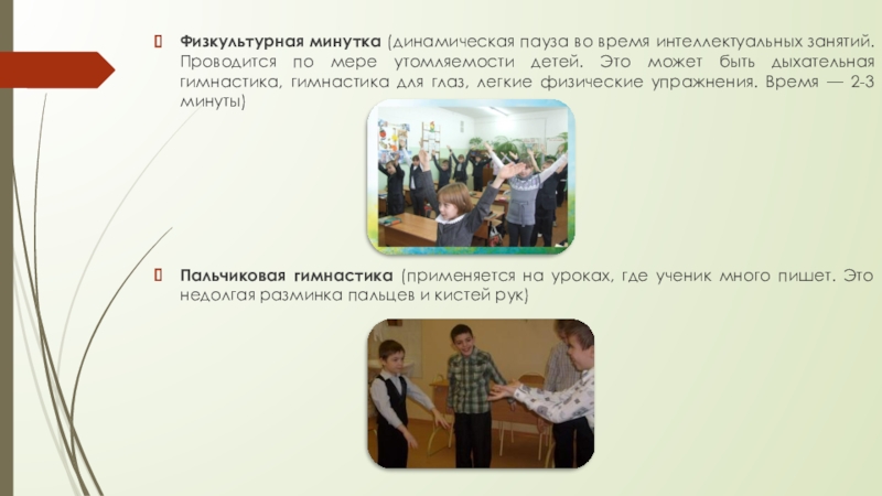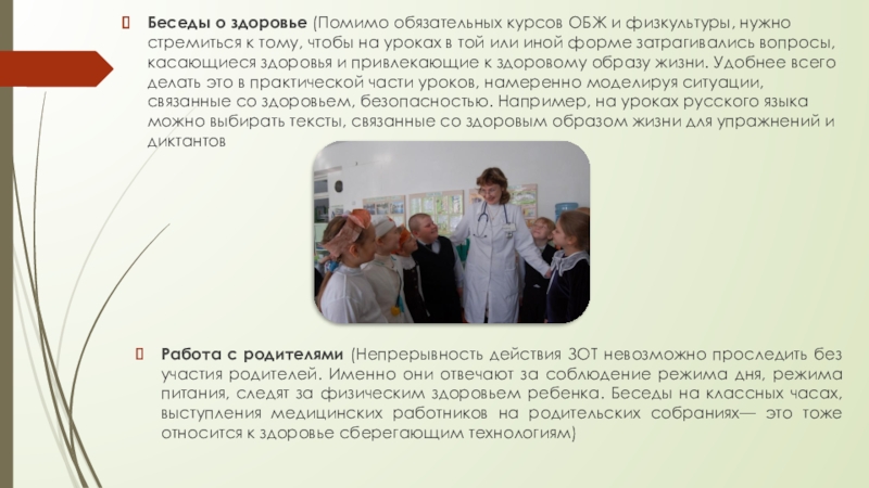 Работа с родителями (Непрерывность действия ЗОТ невозможно проследить без участия родителей. Именно они отвечают за соблюдение режима дня, режима питания, следят за физическим здоровьем ребенка. Беседы на классных часах, выступления медицинских работников на родительских собраниях— это тоже относится к здоровье сберегающим технологиям)