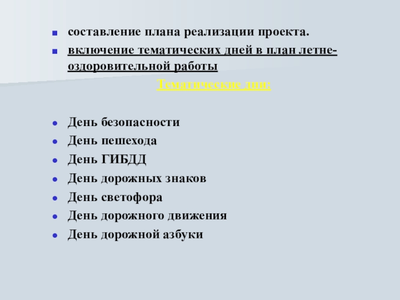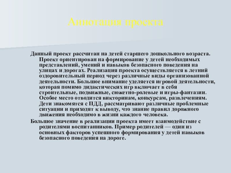на формирование у детей необходимых представлений, умений и навыков безопасного поведения на улицах и дорогах. Реализация проекта осуществляется в летний оздоровительный период через различные виды организованной деятельности. Большое внимание уделяется игровой деятельности, которая помимо дидактических игр включает в себя строительные, подвижные, сюжетно-ролевые и игры-фантазии. Особое место отводится викторинам, конкурсам, развлечениям. Дети знакомятся с ПДД, рассматривают различные проблемные ситуации и приходят к выводу, что знание правил дорожного движения необходимо в жизни каждого человека.