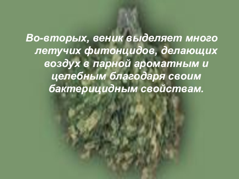 Слайд 17Во-вторых, веник выделяет много летучих фитонцидов, делающих воздух в парной ароматным
