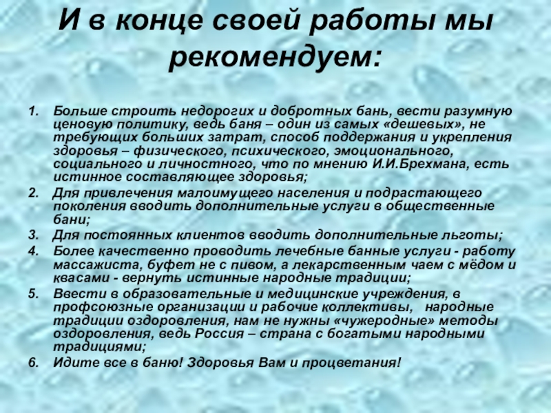 бань, вести разумную ценовую политику, ведь баня – один из самых «дешевых», не требующих больших затрат, способ поддержания и укрепления здоровья – физического, психического, эмоционального, социального и личностного, что по мнению И.И.Брехмана, есть истинное составляющее здоровья;