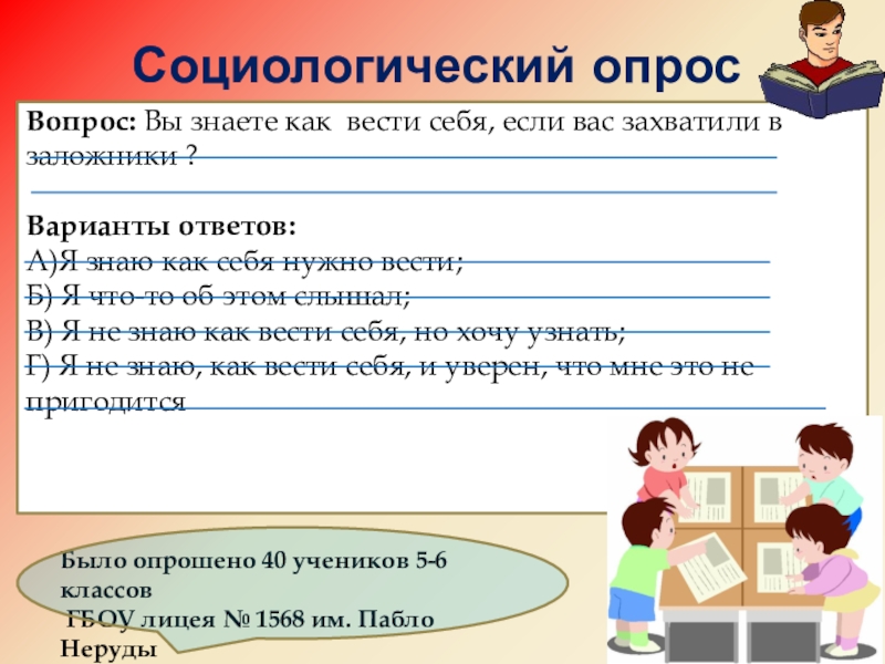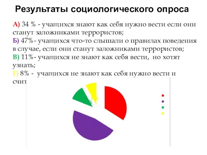Результаты социологического опроса показали, что не все учащиеся лицея знакомы с темой терроризм. Многие ребята не знают о том, как себя нужно вести, чтобы не стать жертвой террористического акта, не знают о правилах поведения в случае, если они стали заложниками. Опрос показал, что есть ребята, которые не только не знают о важности данной проблемы, но и не проявляют желания узнать, как можно себя обезопасить.