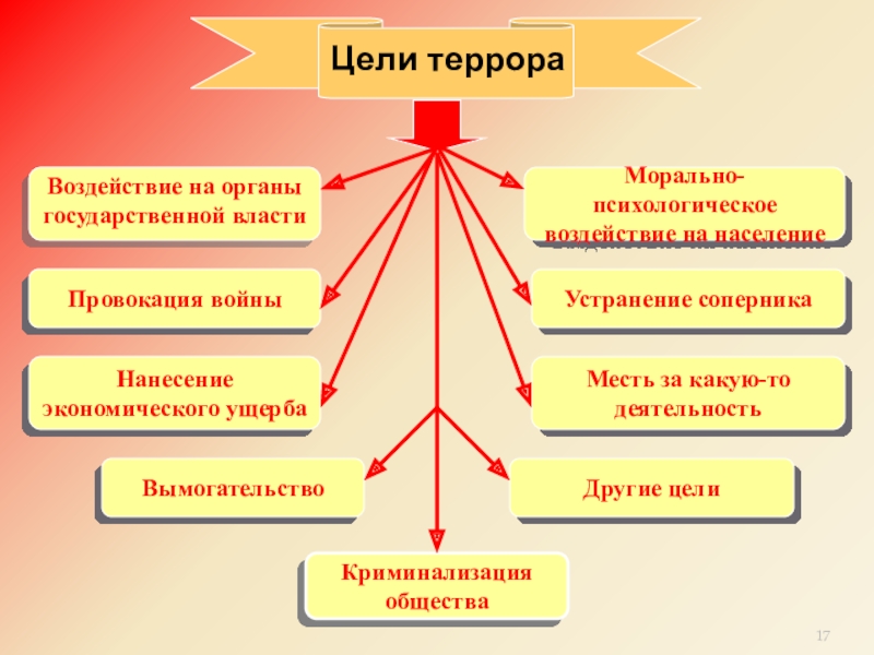 гражданского населения, определенных социальных групп, правительства. К таким действиям относятся взрывы в местах скопления людей, убийства мирных граждан, захват заложников, зданий и самолетов, и каждое подобное преступление совершается группой лиц для осуществления собственных корыстных целей.