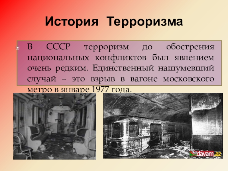 редким. Единственный нашумевший случай – это взрыв в вагоне московского метро в январе 1977 года.