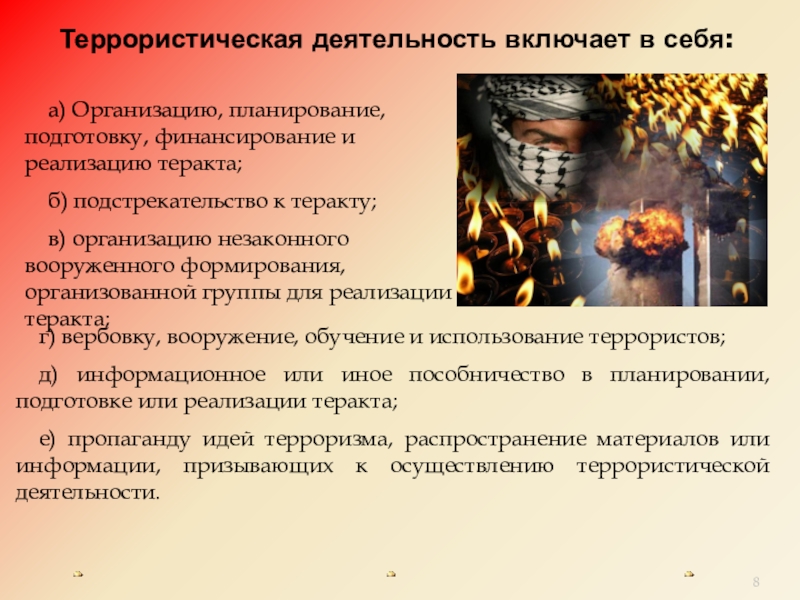 а) Организацию, планирование, подготовку, финансирование и реализацию теракта;
