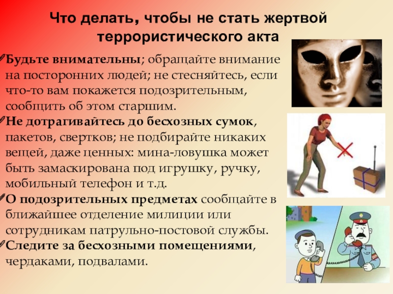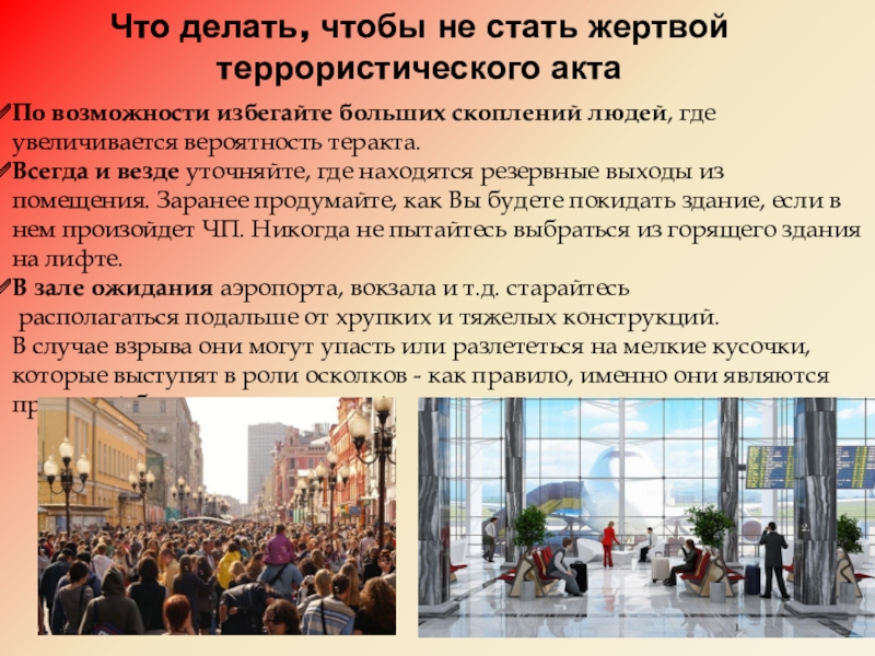 Рассмотреть необходимые правила поведения, чтобы не стать жертвой террористического акта.