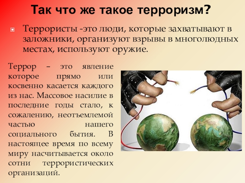 Террор – это явление которое прямо или косвенно касается каждого из нас. Массовое насилие в последние годы стало, к сожалению, неотъемлемой частью нашего социального бытия. В настоящее время по всему миру насчитывается около сотни террористических организаций.