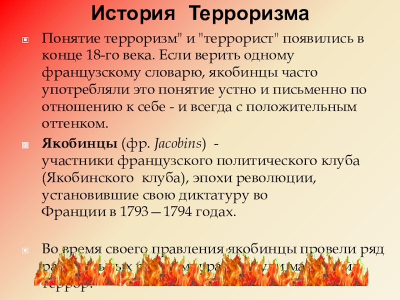 Понятие терроризм" и "террорист" появились в конце 18-го века. Если