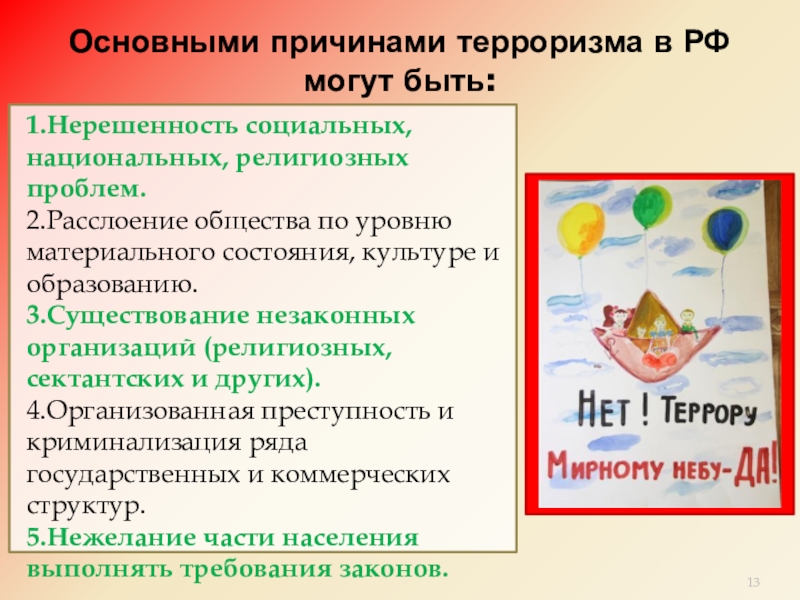 Слайд 13Основными причинами терроризма в РФ могут быть: