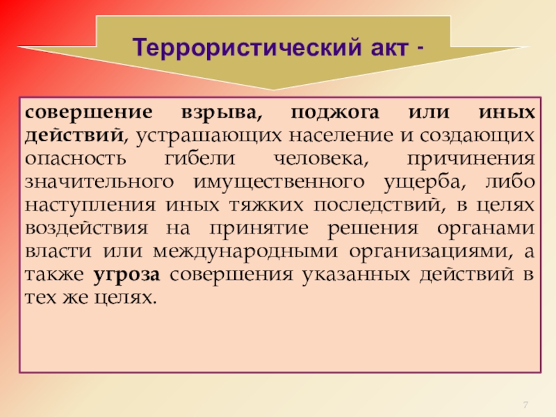 создающих опасность гибели человека, причинения значительного имущественного ущерба, либо наступления иных тяжких последствий, в целях воздействия на принятие решения органами власти или международными организациями, а также угроза совершения указанных действий в тех же целях.