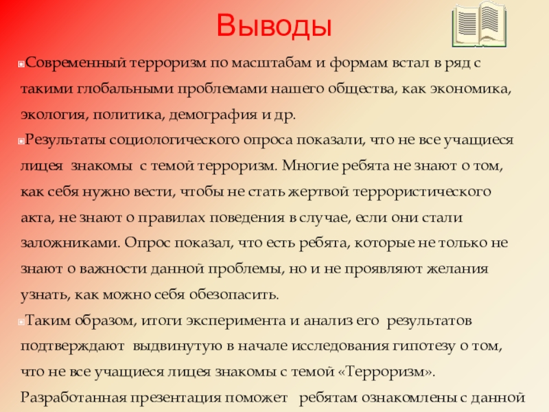 Таким образом, итоги эксперимента и анализ его результатов подтверждают выдвинутую в начале исследования гипотезу о том, что не все учащиеся лицея знакомы с темой «Терроризм». Разработанная презентация поможет ребятам ознакомлены с данной темой