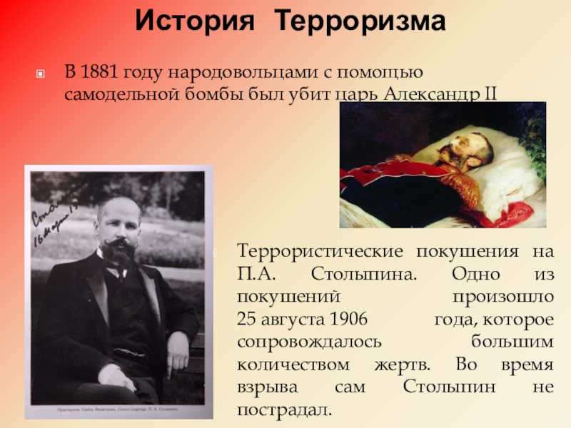 Террористические покушения на П.А. Столыпина. Одно из покушений произошло 25 августа 1906 года, которое сопровождалось большим количеством жертв. Во время взрыва сам Столыпин не пострадал.