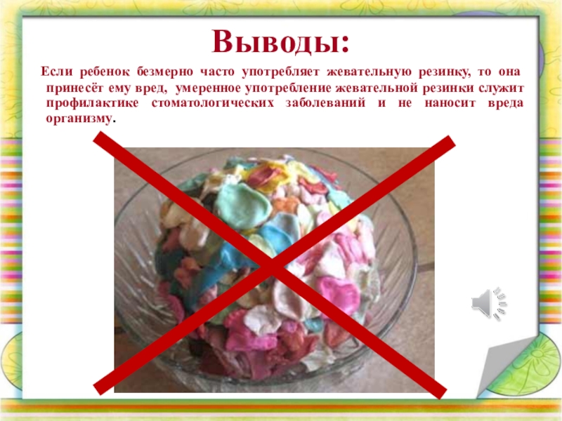 Выводы: Если ребенок безмерно часто употребляет жевательную резинку, то она принесёт ему вред, умеренное употребление жевательной резинки