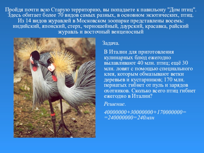 В Италии для приготовления кулинарных блюд ежегодно вылавливают 40 млн. птиц; ещё 30 млн. ловят с помощью специального клея, которым обмазывают ветки деревьев и кустарников; 170 млн. пернатых гибнет от пуль и зарядов охотников. Сколько всего птиц гибнет ежегодно в Италии?