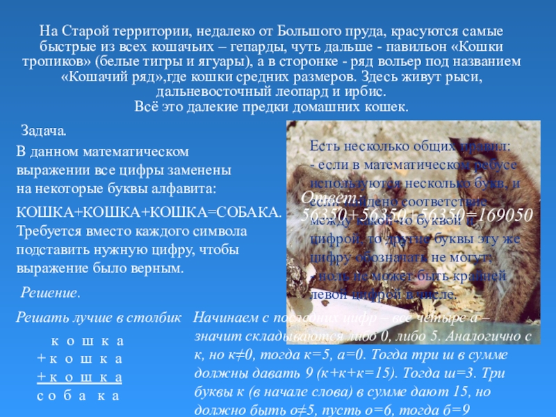 КОШКА+КОШКА+КОШКА=СОБАКА. Требуется вместо каждого символа подставить нужную цифру, чтобы выражение было верным.
