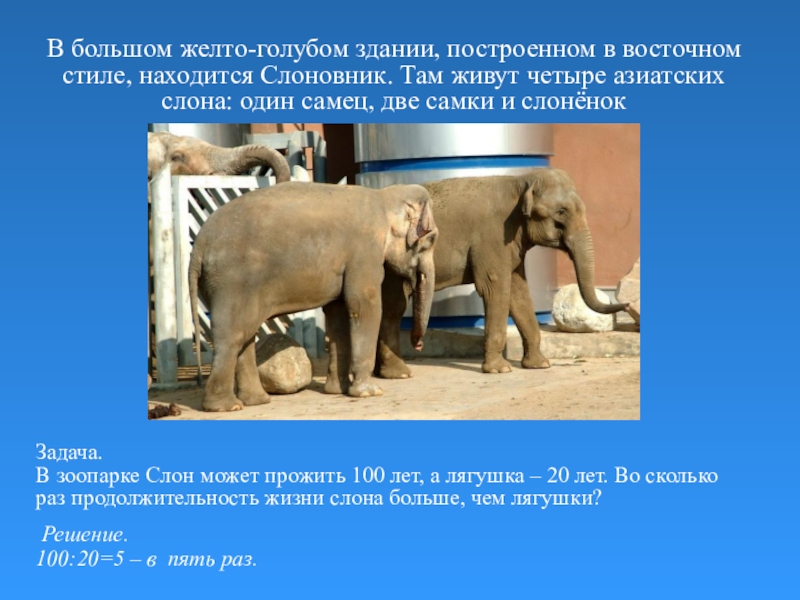 В зоопарке Слон может прожить 100 лет, а лягушка – 20 лет. Во сколько раз продолжительность жизни слона больше, чем лягушки?