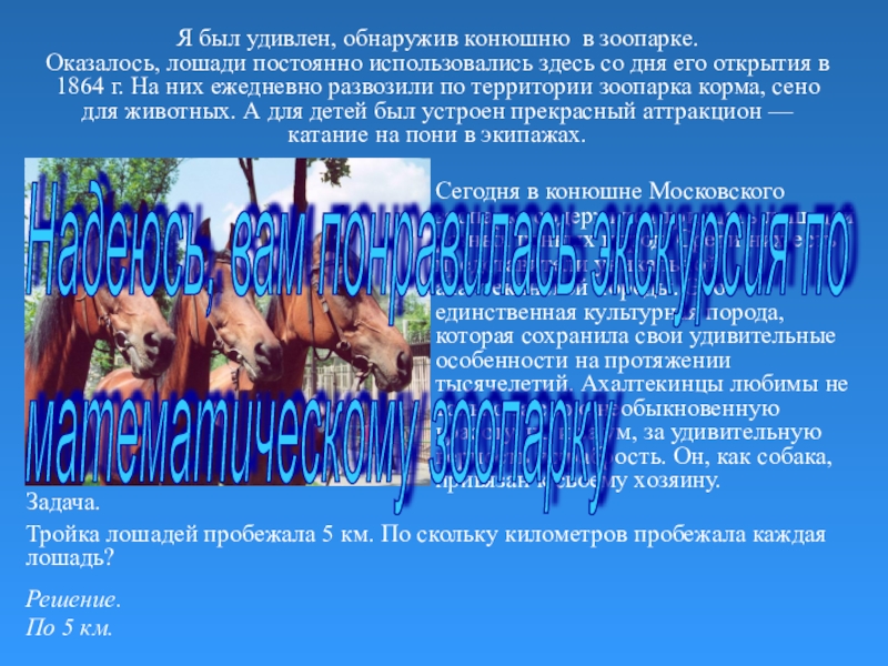 Сегодня в конюшне Московского зоопарка содержится тридцать лошадей разных ценных пород. Среди них есть представители уникальной ахалтекинской породы. Это единственная культурная порода, которая сохранила свои удивительные особенности на протяжении тысячелетий. Ахалтекинцы любимы не только за свою необыкновенную красоту, но и за ум, за удивительную верность и храбрость. Он, как собака, привязан к своему хозяину.