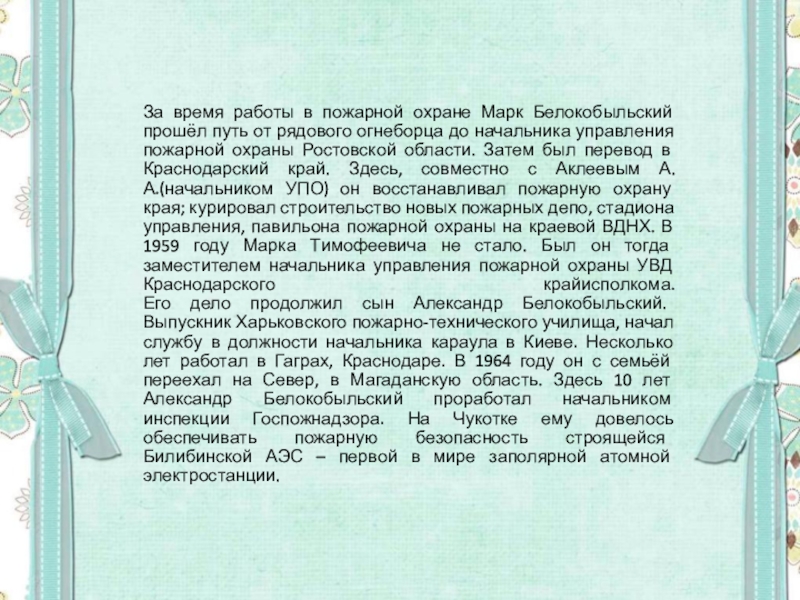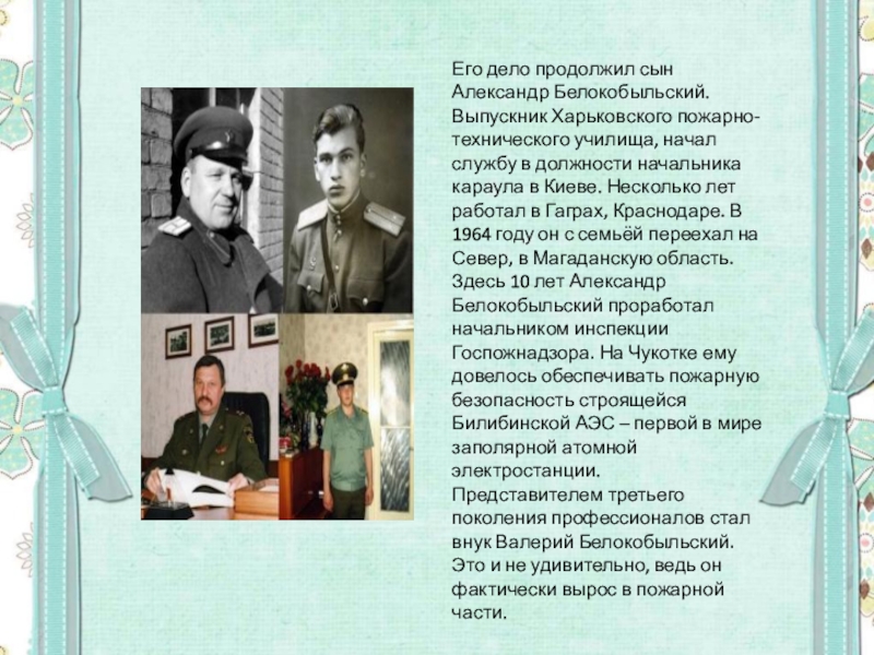 Слайд 11Его дело продолжил сын Александр Белокобыльский. Выпускник Харьковского пожарно-технического училища, начал