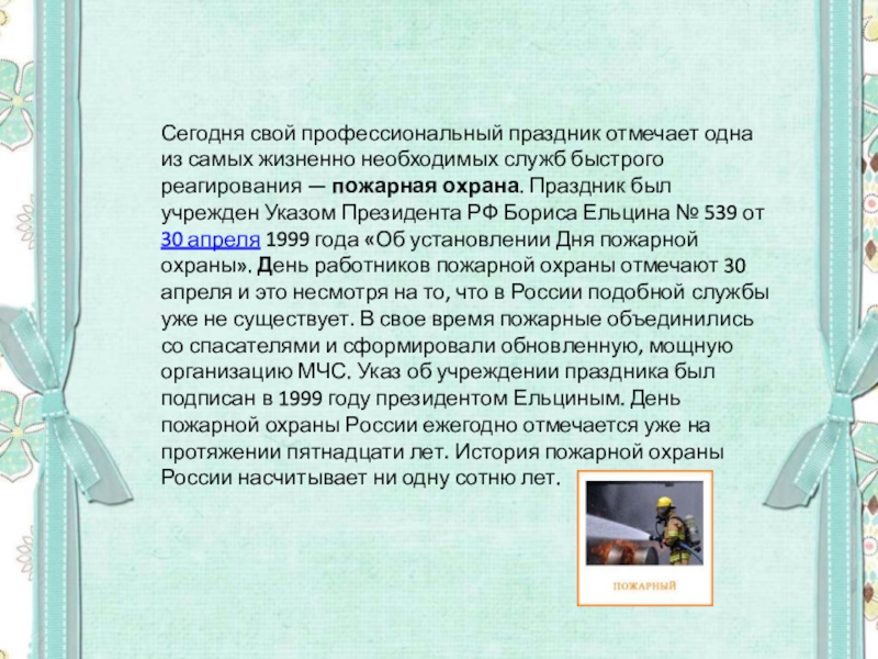 быстрого реагирования — пожарная охрана. Праздник был учрежден Указом Президента РФ Бориса Ельцина № 539 от 30 апреля 1999 года «Об установлении Дня пожарной охраны». День работников пожарной охраны отмечают 30 апреля и это несмотря на то, что в России подобной службы уже не существует. В свое время пожарные объединились со спасателями и сформировали обновленную, мощную организацию МЧС. Указ об учреждении праздника был подписан в 1999 году президентом Ельциным. День пожарной охраны России ежегодно отмечается уже на протяжении пятнадцати лет. История пожарной охраны России насчитывает ни одну сотню лет.