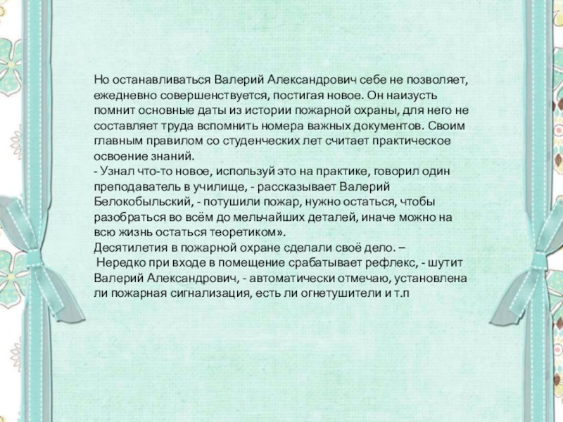 Слайд 13Но останавливаться Валерий Александрович себе не позволяет, ежедневно совершенствуется, постигая новое.