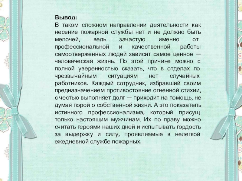 не должно быть мелочей, ведь зачастую именно от профессиональной и качественной работы самоотверженных людей зависит самое ценное — человеческая жизнь. По этой причине можно с полной уверенностью сказать, что в отделах по чрезвычайным ситуациям нет случайных работников. Каждый сотрудник, избравший своим предназначением противостояние огненной стихии, с честью выполняет долг — приходит на помощь, не думая порой о собственной жизни. А это показатель истинного профессионализма, который присущ только настоящим мужчинам. Их по праву можно считать героями наших дней и испытывать гордость за выдержку и силу, проявляемые в нелегкой ежедневной службе пожарных.