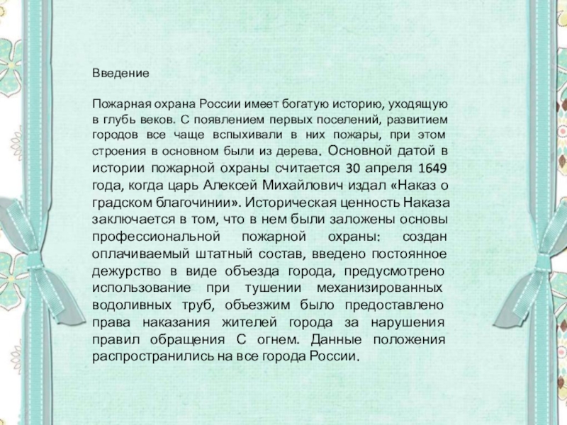появлением первых поселений, развитием городов все чаще вспыхивали в них пожары, при этом строения в основном были из дерева. Основной датой в истории пожарной охраны считается 30 апреля 1649 года, когда царь Алексей Михайлович издал «Наказ о градском благочинии». Историческая ценность Наказа заключается в том, что в нем были заложены основы профессиональной пожарной охраны: создан оплачиваемый штатный состав, введено постоянное дежурство в виде объезда города, предусмотрено использование при тушении механизированных водоливных труб, объезжим было предоставлено права наказания жителей города за нарушения правил обращения С огнем. Данные положения распространились на все города России.