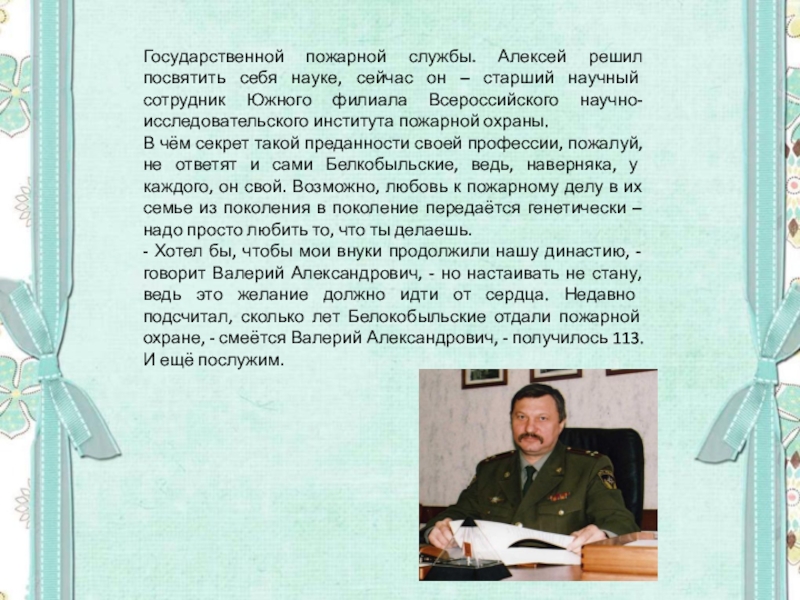 Слайд 14Государственной пожарной службы. Алексей решил посвятить себя науке, сейчас он –